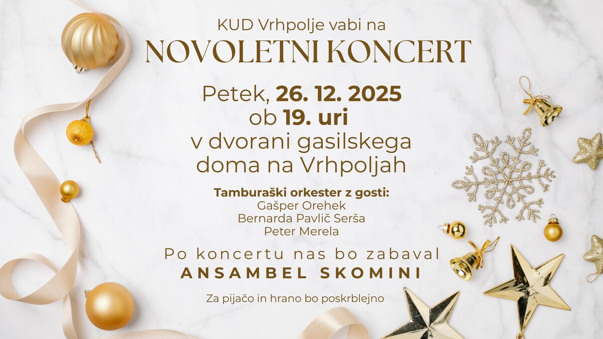 v imenu Kulturnega društva Vrhpolje vas lepo vabimo na novoletni koncert, ki bo v petek, 26. decembra 2025, ob 19. uri v Kulturnem domu Vrhpolje.
