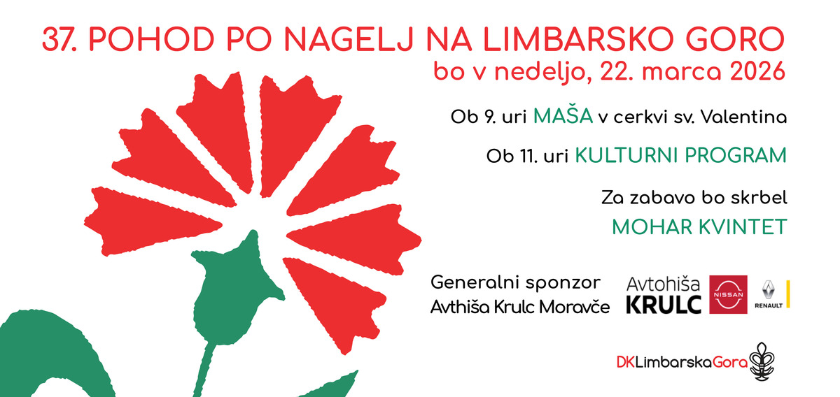 Vabim vas, da se v nedeljo, 22. marca 2026, udeležite 37. pohoda po nagelj na Limbarsko goro. Tradicionalni pohod se začenja od zjutraj naprej, druženje na vrhu Limbarske gore pa bo trajalo ves dan. Ob 9h bo v cerkvi sv. Valentina maša, od 11h naprej pa je na vrsti kulturni in zabavni program. Vabljeni!